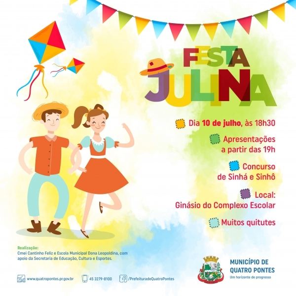 Organizada pelo Centro Municipal de Educação Infantil (Cmei) Cantinho Feliz e a Escola Municipal Dona Leopoldina, de Quatro Pontes, com o apoio da Secretaria de Educação, Cultura e Esportes e da Associação de Pais, Mestres e Funcionários (APMF) da escola e do Cmei, Festa Julina será realizada amanhã (10), no Ginásio de Esportes do Complexo Escolar.
