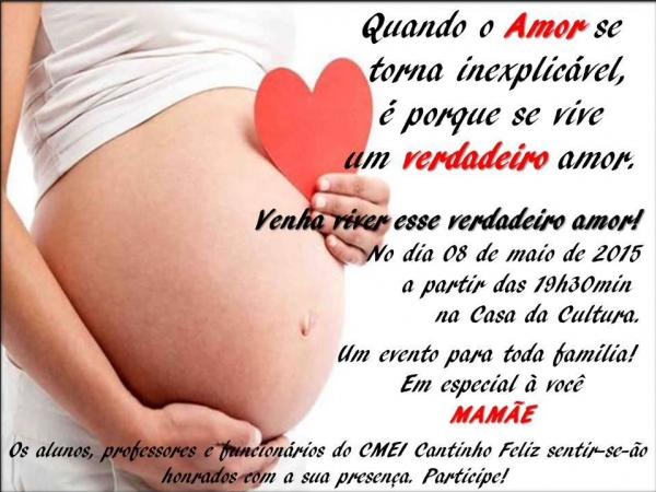 Segundo a diretora do CMEI, Paula Becker, alunos, professores e funcionários irão realizar belas homenagens que tornarão a noite memorável. “Estamos preparando tudo com muito carinho para comemorar esta data especial, perto das mamães dos nossos alunos bem como das mamães da nossa comunidade. Todos estão convidados”.