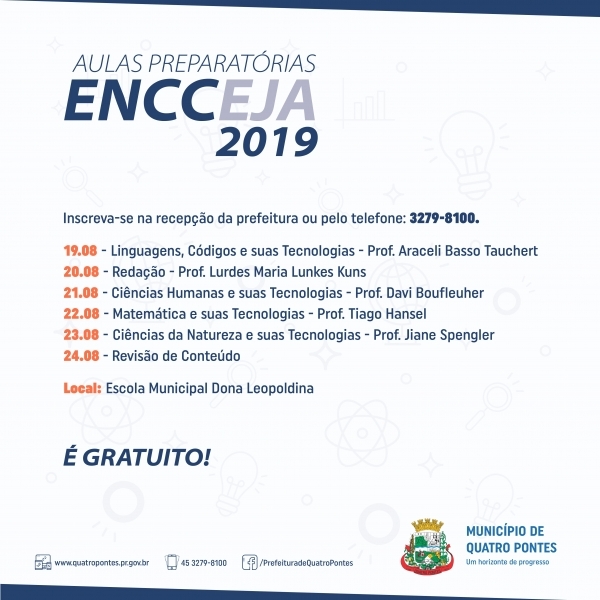 Seguem abertas até o dia 09 de agosto, na recepção da Prefeitura de Quatro Pontes, as inscrições para aulas preparatórias aos inscritos no Exame Nacional para Certificação de Competências de Jovens e Adultos (Encceja) 2019. A iniciativa é da Secretaria de Educação, Cultura e Esportes, que ofertará o ensino de graça.