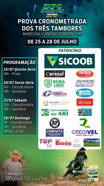Rafaela Francener Fritz e Heloisa Brandt Endres, de Quatro Pontes, disputarão a Prova Cronometrada dos Três Tambores, que integra a programação da Expo Rondon 2019. Tendo como palco a arena de rodeio no Parque de Exposições Álvaro Dias, as disputas iniciarão amanhã (25). Às 16 horas acontecerá a primeira prova.
