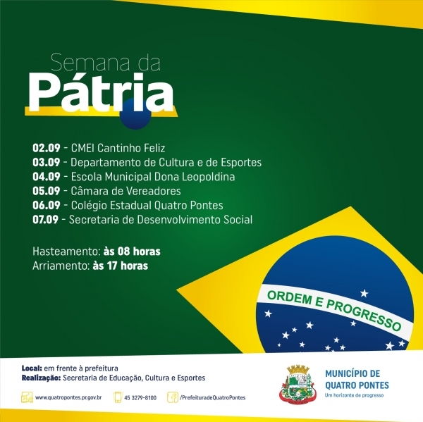 Tendo em vista que no dia 07 de setembro é celebrado o Dia da Independência do Brasil, a Secretaria de Educação, Cultura e Esportes, de Quatro Pontes, promoverá na próxima semana, de 02 a 07, a Semana da Pátria, evento tradicional e que engloba o hasteamento e o arriamento da bandeira, incluindo apresentação e/ou mensagem.