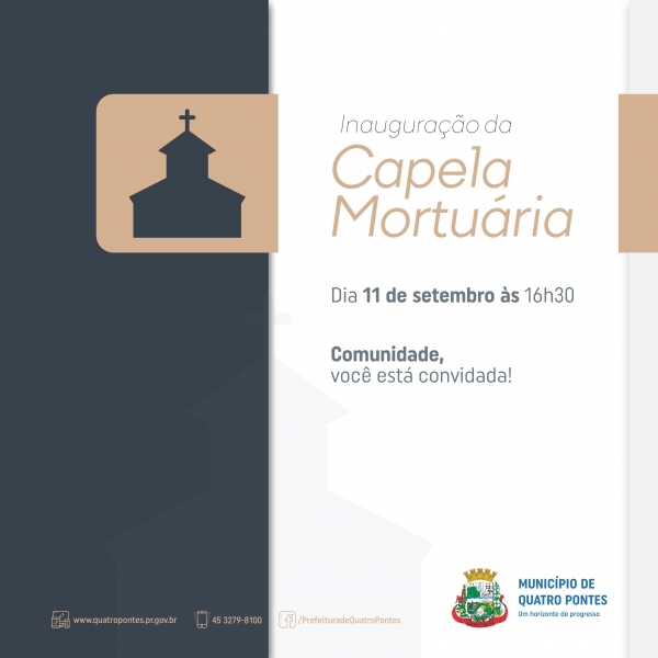 Integrando a programação do 27º aniversário de emancipação político-administrativa de Quatro Pontes, o Poder Público realizará amanhã (11), às 16h30, a inauguração da capela mortuária, situada na Rua Bagé, em frente ao cemitério municipal. A obra foi executada pela Prespontes Serviços Ltda., empresa vencedora do processo licitatório, mediante investimento inicial de R$ 266.462,64, oriundos de recursos próprios. Com o aditivo, o valor totalizou R$ 306.504,99.