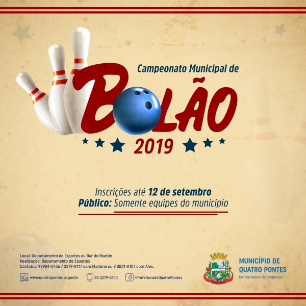 Na quinta-feira (12), encerra o prazo de inscrições ao Campeonato Municipal de Bolão 2019, categorias feminino e masculino, organizado pelo Departamento de Esportes, de Quatro Pontes. Elas devem ser feitas junto ao departamento ou no Bar do Martim.