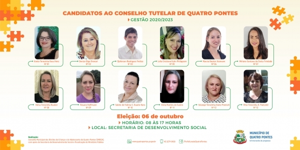 Os 12 candidatos a conselheiros tutelares de Quatro Pontes seguem em campanha. A eleição ocorrerá no próximo dia 06 de outubro, das 08 às 17 horas, na Secretaria de Desenvolvimento Social. A realização é do Conselho Municipal dos Direitos da Criança e do Adolescente (CMDCA), com o apoio da Secretaria de Desenvolvimento Social e a fiscalização do Ministério Público.