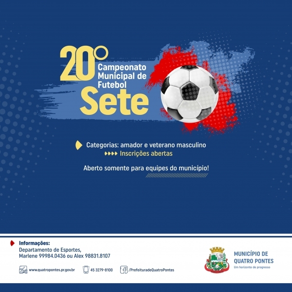Está marcado para às 19h30 de hoje (07), na sala de reuniões da Prefeitura de Quatro Pontes, o congresso técnico da 20ª edição do Campeonato Municipal de Futebol Sete, categorias amador e veterano masculino. Na ocasião, será debatido o encerramento do período de inscrições, entre outros assuntos.