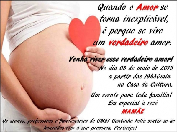 Acontecerá na noite de hoje (08) a apresentação do CMEI Cantinho Feliz em comemoração ao Dia das Mães. A programação começa às 19h30, na Casa da Cultura.