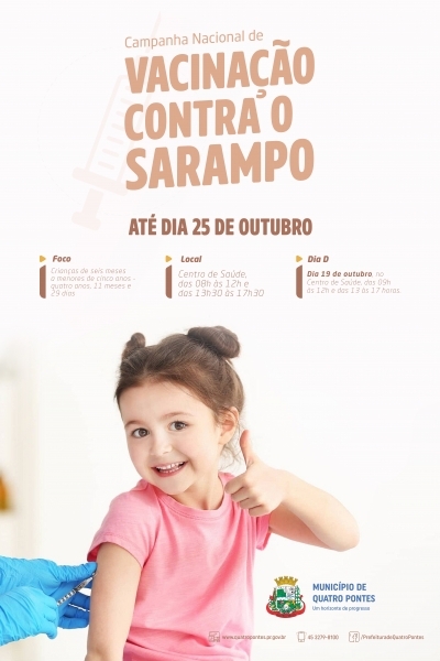 No sábado (19), a Secretaria de Saúde, de Quatro Pontes, realiza o Dia D da Campanha Nacional de Vacinação contra o Sarampo. Nesta etapa, devem se vacinar crianças entre seis meses e quatro anos, 11 meses e 29 dias. O Centro de Saúde atenderá das 09 ao meio-dia e das 13 às 17 horas.