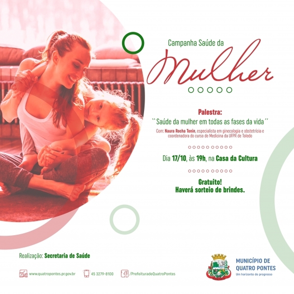 Integrando a campanha Saúde da Mulher, desenvolvida durante o Setembro Rosa, palestra intitulada “Saúde da mulher em todas as fases da vida” será promovida hoje (17) na Casa da Cultura, em Quatro Pontes. Organizado pela Secretaria de Saúde, o evento gratuito está marcado para às 19 horas e contemplará sorteio de brindes.