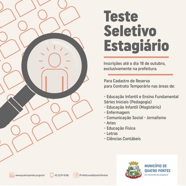 Termina hoje (18) o prazo de inscrições para o teste seletivo 03/2019, de prova escrita, que visa o preenchimento de vagas e cadastro de reserva de estagiário para contrato temporário na Prefeitura de Quatro Pontes. Elas devem ser realizadas exclusivamente no paço municipal, via protocolo, com atendimento das 08h30 às 11h45 e das 13h45 às 17 horas. É gratuito.