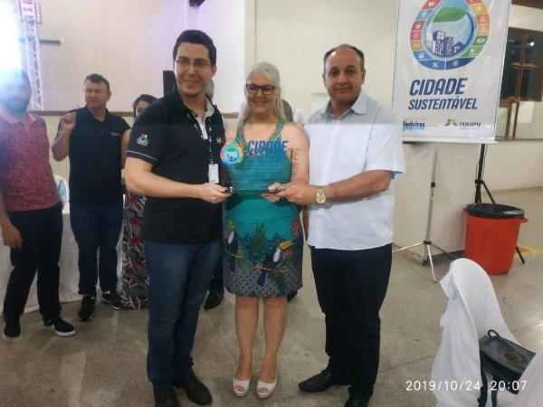 Evento para entrega de prêmio em reconhecimento à participação no Programa Cidades Sustentáveis foi realizado ontem (24), no Balneário Terra das Águas, em Santa Helena, reunindo representantes dos 54 municípios que integram à Associação dos Municípios do Oeste do Paraná (Amop). Trata-se de um selo pela participação e pelos trabalhos em dois anos de convênio. Quatro Pontes esteve representado pelo prefeito João Laufer e a diretora do Departamento de Meio Ambiente, ligado à Secretaria de Desenvolvimento Econômico, Rosa Maria Sulzbach.
