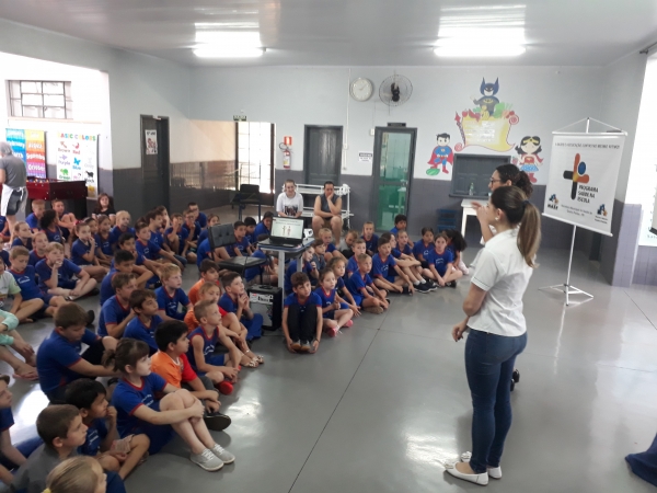 Com a temática “Alimentação saudável e prevenção da obesidade infantil”, palestra foi ministrada aos alunos da Escola Municipal Dona Leopoldina, de Quatro Pontes, como parte de uma ação do Programa Saúde na Escola (PSE) no mês de outubro. Os assuntos foram esclarecidos através da nutricionista da Secretaria de Saúde, Priscila Kelly Rossato Neuberger, com o apoio da nutricionista da Secretaria de Educação, Jussara Gheller.