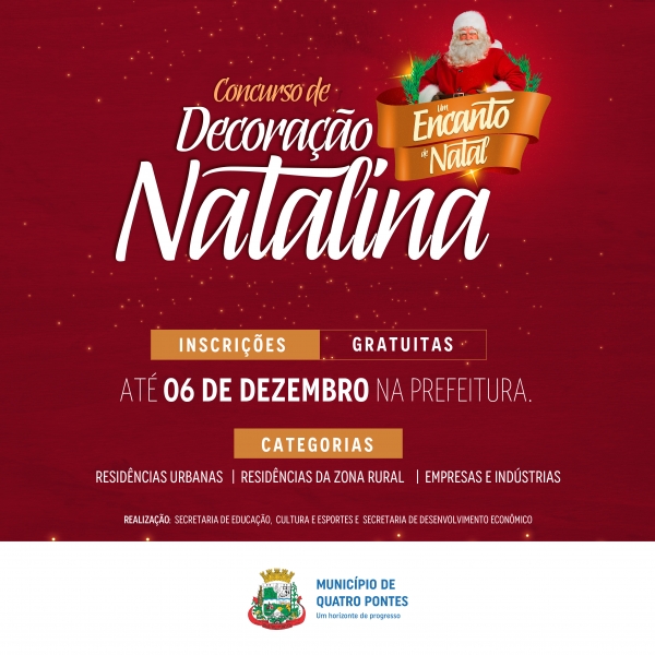 O tema do concurso deste ano foi definido como “Um Encanto de Natal”. As inscrições poderão ser feitas a partir do próximo dia 18, junto à Secretaria de Educação, Cultura e Esportes, encerrando no dia 06 de dezembro. Aprovado como lei, o concurso será realizado anualmente pelo Município de Quatro Pontes, através da Secretaria de Educação, Cultura e Esportes e a Secretaria de Desenvolvimento Econômico, considerando a lei nº 2258/2019.