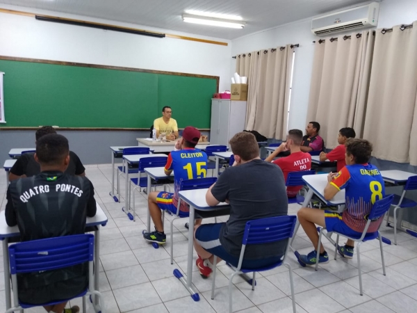 Na noite de ontem (18), os atletas integrantes das escolas de treinamento de base de Quatro Pontes participaram de palestra ministrada por Mário Ferrari, tendo como tema “Escolha consciente na busca da melhor performance”, junto à Escola Municipal Dona Leopoldina.