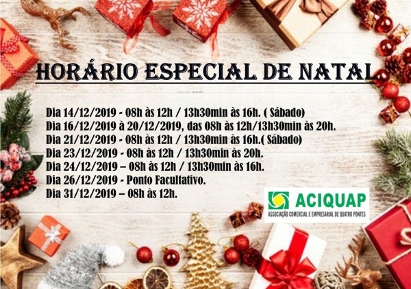 A partir do próximo sábado (14), o comércio de Quatro Pontes terá horário especial de Natal, a fim de oportunizar os munícipes às compras. O funcionamento foi divulgado pela Associação Comercial e Empresarial (Aciquap), sendo das 08 ao meio-dia e das 13h30 às 16 horas no dia 14; das 08 ao meio-dia e das 13h30 às 20 horas do dia 16 a 20; das 08 ao meio-dia e das 13h30 às 16 horas no dia 21; das 08 ao meio-dia e das 13h30 às 20 horas no dia 23; das 08 ao meio-dia e das 13h30 às 16 horas no dia 24; ponto facultativo será feito no dia 26; e no dia 31 o atendimento será das 08 ao meio-dia.