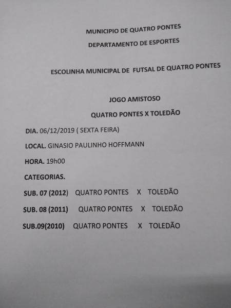 Hoje (06), a partir das 19 horas, os alunos da Escolinha Municipal de Futsal de Quatro Pontes tem amistoso marcado contra Toledão, junto ao Ginásio de Esportes Paulinho Hoffmann. Os jogos serão nas categorias sub-07 (2012), sub-08 (2011) e sub-09 (2010). Os atletas quatropontenses tem como professor e técnico Edevaldo Moura dos Santos (Mico) e são apoiados pelo Departamento de Esportes.