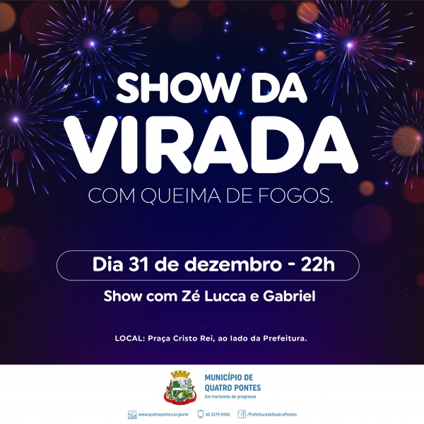 Quatro Pontes se prepara para mais uma virada de ano. A prefeitura, por intermédio da Secretaria de Educação, Cultura e Esportes, organizou uma programação especial para festejar a chegada de 2020 na Praça Cristo Rei. A partir das 22 horas haverá show com a dupla Zé Lucca e Gabriel e na virada de ano terá queima de fogos.