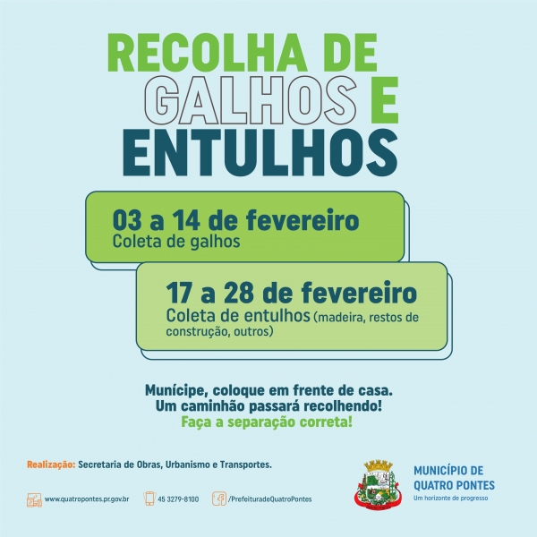 Ontem (03), a Prefeitura de Quatro Pontes, por meio da Secretaria de Obras, Urbanismo e Transportes, iniciou a Campanha de Recolha de Galhos e Entulhos 2020 na sede do município. Deste modo, até o próximo dia 14 haverá coleta de galhos. Após, do dia 17 a 28, um caminhão passará recolhendo entulhos, desde madeiras, restos de construção, entre outros materiais.
