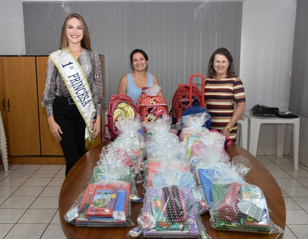 Um total de 34 kits com material escolar serão entregues amanhã (07) para as crianças atendidas pelo Centro de Referência de Assistência Social (Cras), através do serviço de Proteção e Atendimento Integral à Família (PAIF), de Quatro Pontes. A ação integra o projeto social “Lição solidária”, realizado pela 1ª Princesa de Quatro Pontes, Gabriela Milena Dorner Gartner, de 13 de janeiro até a última segunda-feira (03), mediante apoio da Secretaria de Desenvolvimento Social e de Educação, Cultura e Esportes. O repasse dos kits à Secretaria de Desenvolvimento Social ocorreu hoje (06), sendo recebidos pela secretária e primeira-dama Odete Laufer e pela diretora do Departamento de Ações Comunitárias, Fatima Borth.
