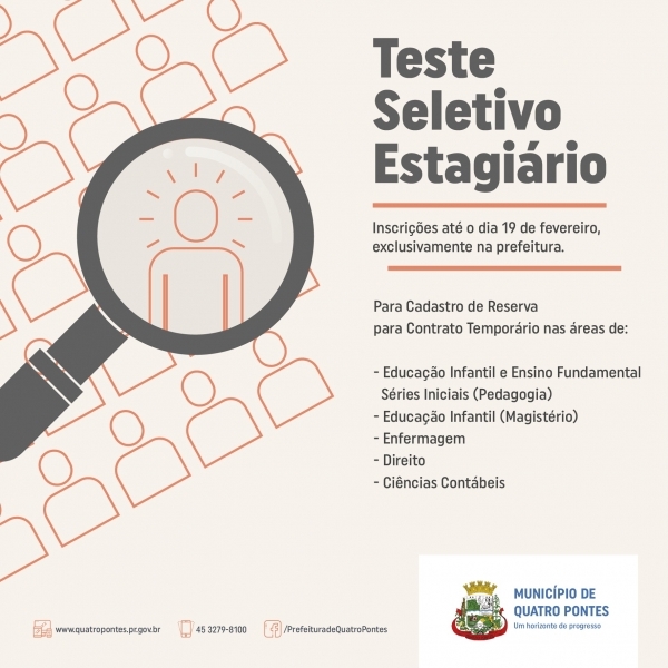 Na quarta-feira (19), a Prefeitura de Quatro Pontes irá encerrar o período de inscrições para o teste seletivo 01/2020, de prova escrita, para cadastro de reserva de estagiário de contrato temporário. As inscrições devem ser feitas exclusivamente na prefeitura, via protocolo, com atendimento das 08h30 às 11h45 e das 13h45 às 17 horas.