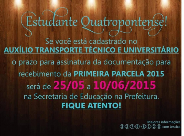 O prazo para que os alunos cadastrados no Auxílio Transporte Técnico e Universitário compareçam a Prefeitura para realizar a assinatura da documentação a fim de receber a primeira parcela de 2015 será de 25/05 a 10/06, na Secretaria de Educação.