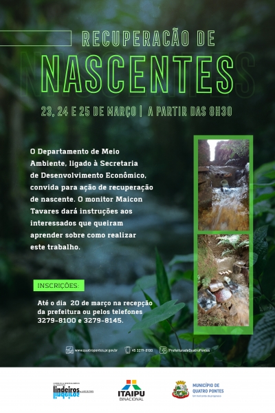 A fim de celebrar o Dia Mundial da Água, comemorado anualmente em 22 de março, o Departamento de Meio Ambiente, de Quatro Pontes, transferiu a ação de recuperação de três novas nascentes no interior do município para os dias 23, 24 e 25 do próximo mês, a partir das 08h30. Em vista disso, as inscrições para receber instruções do monitor Maicon Tavares seguirão abertas até o dia 20 de março. Elas devem feitas na recepção da prefeitura ou através dos telefones 3279-8100 e 3279-8145, sem custos.