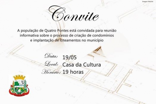 Será realizada na noite desta terça-feira (19) às 19 horas, na Casa da Cultura, uma reunião informativa sobre o processo de criação de condomínios e implantação de loteamentos no município. Participarão o corpo técnico da Prefeitura, equipe de engenharia e a assessoria jurídica. Toda a comunidade está convidada.
