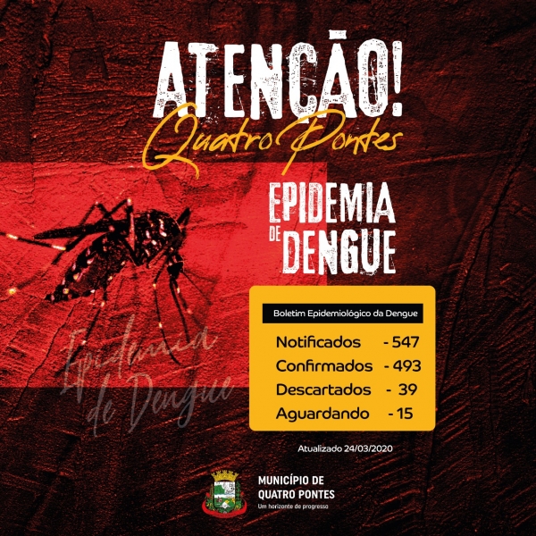 Apesar de concentrado nas medidas para o enfrentamento ao novo coronavírus (Covid-19), Quatro Pontes, através da Secretaria de Saúde e do Setor de Controle de Endemias, demostra grande preocupação com os casos de dengue confirmados, que não param de aumentar diariamente. Hoje (24), conforme boletim da Secretaria de Saúde, o município registra 493 casos confirmados, 547 notificados, 39 descartados e 15 em investigação.