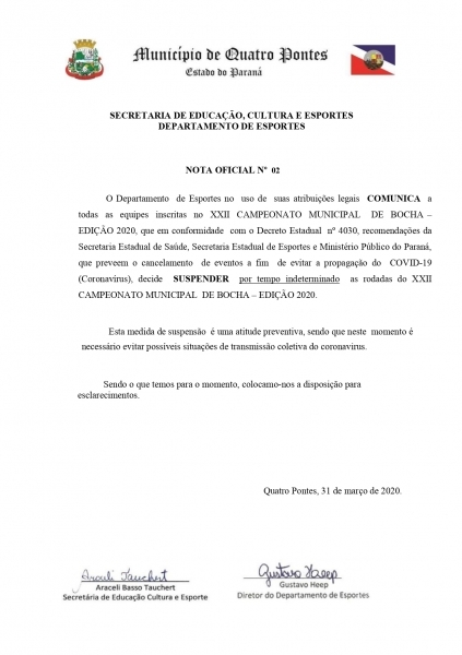 O Departamento de Esportes, de Quatro Pontes, decidiu suspender as rodadas do 22º Campeonato Municipal de Bocha por tempo indeterminado. Esta medida é uma atitude preventiva e em conformidade ao decreto estadual nº 4030, com recomendações da Secretaria de Estado da Saúde (Sesa), Secretaria de Estado de Esporte e Turismo do Paraná e do Ministério Público Estado do Paraná (MPPR) e que preveem o cancelamento de eventos, a fim de evitar a propagação do novo coronavírus (Covid-19). Assim, é necessário evitar possíveis situações de transmissão coletiva do coronavírus.