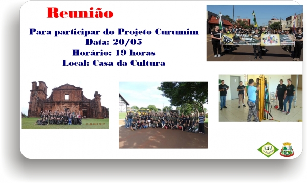 Acontecerá às 19 horas desta quarta-feira (20) junto a Casa da Cultura de Quatro Pontes uma reunião sobre o Projeto Curumim. Interessados em participar dos Curumins devem comparecer. Na ocasião será feita a apresentação do projeto, seus objetivos e principais iniciativas.