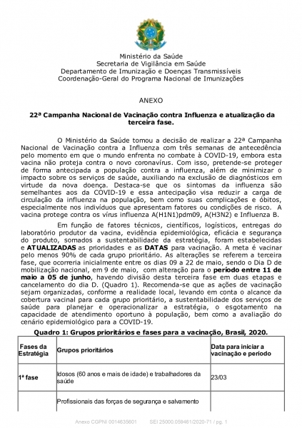 As alterações se referem à terceira fase, que inicialmente ocorreria entre os dias 09 a 22 de maio e agora será no período entre 11 de maio a 05 de junho, havendo divisão desta terceira fase em duas etapas. Portanto, a primeira etapa da terceira fase ocorrerá de 11 a 17 de maio, tendo como público-alvo crianças de seis meses a menores de seis anos de idade, pessoas com deficiência, gestantes e puérperas até 45 dias após o parto. Já a segunda etapa acontecerá entre 18 de maio a 05 de junho e será voltada para adultos de 55 a 59 anos de idade e professores das escolas públicas e privadas.