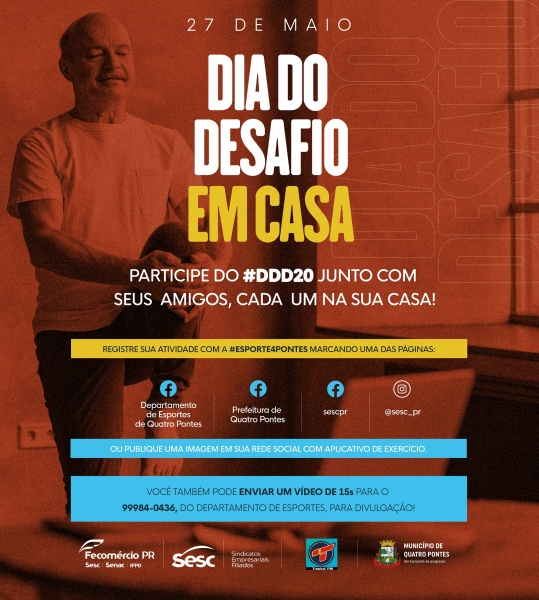No município quatropontense, explica o diretor do Departamento de Esportes, Gustavo Heep, os munícipes podem registrar sua atividade com a #ESPORTE4PONTES, marcando a página do Departamento de Esportes de Quatro Pontes e/ou da Prefeitura de Quatro Pontes no Facebook. “Outra opção é publicar uma imagem em sua rede social com o aplicativo de exercício. Quem quiser também pode enviar um vídeo de no máximo 15s para o telefone 99984-0436, que é do departamento, para divulgação. Convidamos toda a comunidade para participar. Neste ano será diferente por conta do isolamento social, mas podemos fazer a diferença com exercícios em casa, inclusive todos os dias, não somente no DDD”, expõe.