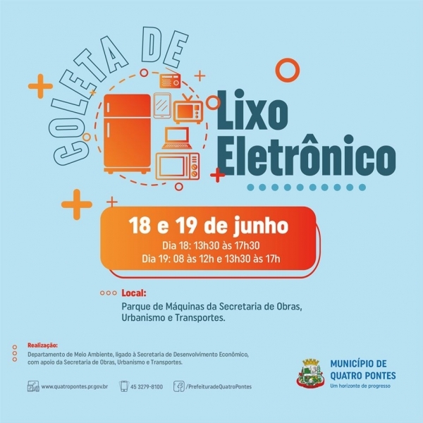 Nesta quinta (18) e sexta-feira (19), Quatro Pontes terá a primeira campanha de coleta de lixo eletrônico deste ano. A ação é do Departamento de Ação Ambiental, ligado à Secretaria de Desenvolvimento Econômico, mediante o apoio da Secretaria de Obras, Urbanismo e Transportes, visando recolher o maior número possível de equipamentos.