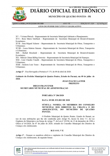 Foi publicado na data de ontem (09), no Diário Oficial, a portaria nº 286/2020, que nomeia os membros efetivos e suplentes do Conselho Municipal dos Direitos da Criança e do Adolescente (CMDCA), de Quatro Pontes. Logo, integram o CMDCA representantes governamentais, sendo Cleunice Majolo (titular) e Odete Maria Riedel Laufer (suplente), da Secretaria de Desenvolvimento Social; Jiane Grasiele Perius Spengler (titular) e Adriana Leobet Bregoli (suplente), da Secretaria de Educação, Cultura e Esportes; Cheila Borchert (titular) e Raquel Aparecida Bieger (suplente), da Secretaria de Finanças; além de representantes não governamentais, como Lúcia Fridrich (titular) e Lúcia Correia Camyli (suplente), da Pastoral da Criança; Elisabete Aline Naumann Bourscheidt (titular) e Deisi Caroline Giacomini (suplente), da Associação de Pais e Mestres e Funcionários (APMF) da Escola Municipal Dona Leopoldina e Cmei Cantinho Feliz; e Márcia Inês Goetz Finkler (titular) e Berenice Maria Vogel Wammes (suplente), da Associação de Pais e Mestres e Funcionários (APMF) do Colégio Estadual Quatro Pontes.