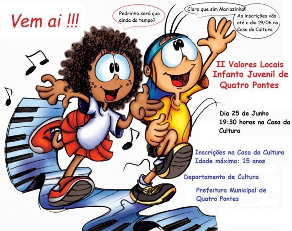 Hoje (19) é o último dia para realizar a inscrição a fim de participar do II Valores Locais Infanto Juvenil de Quatro Pontes. O evento organizado pela Secretaria de Educação, Cultura e Esportes será no dia 25 de junho, com início às 19h30, na Casa da Cultura.