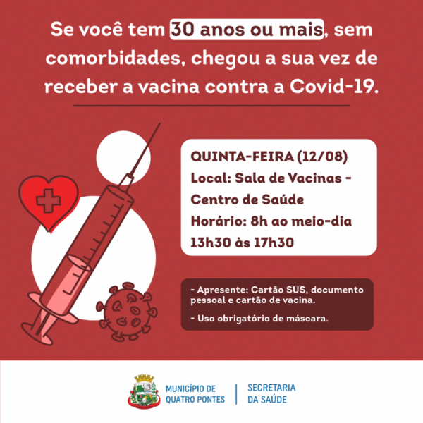 A Secretaria de Saúde de Quatro Pontes programou para amanhã (12) a vacinação contra a Covid-19 de pessoas de 30 anos ou mais sem comorbidades. Os munícipes deverão procurar a Sala de Vacinas, no Centro de Saúde, das 08 ao meio-dia e das 13h30 às 17h30.