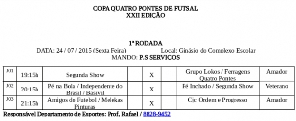 Os jogos acontecerão no Ginásio de Esportes do Complexo Escolar em segundas, quartas e sextas-feiras sempre com início às 19h15.