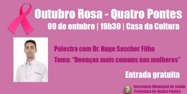 Segundo a Secretária Municipal de Saúde, Ana Maria Görgen, a palestra integra a programação do Outubro Rosa. “Este mês é o mês da luta e prevenção contra o câncer de mama. Quatro Pontes preparou diversas atividades para envolver a população feminina. Gostaria de convidar a todas. Vai ser uma noite muito especial”, disse.