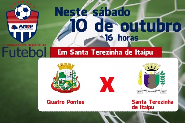 Neste sábado (10) Quatro Pontes joga em Santa Terezinha de Itaipu, pela 7º Edição da Copa AMOP de Futebol.  O jogo começa às 16 horas. Quatro Pontes enfrenta o time da casa. A saída do ônibus somente para jogadores da equipe de Quatro Pontes será às 12 horas, em frente ao Centro Poliesportivo.