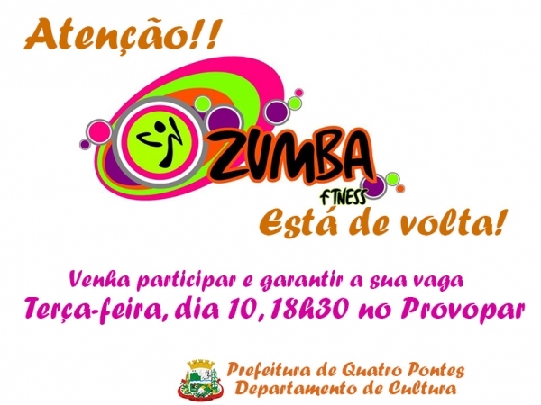 As aulas gratuitas de Zumba estão de volta a Quatro Pontes. O recomeço está marcado para acontecer hoje, às 18h30 no Provopar. Conforme a Diretora do Departamento de Cultura, Camila Theobald, a Zumba já volta com tudo e muita dança espera os participantes. “É importante comparecer a esta primeira aula mesmo não tendo feito inscrição pois além de darmos início a esta nova etapa já dançando e se divertindo, também serão repassadas todas as informações pertinentes. Venha participar e garantir a sua vaga”, informou.