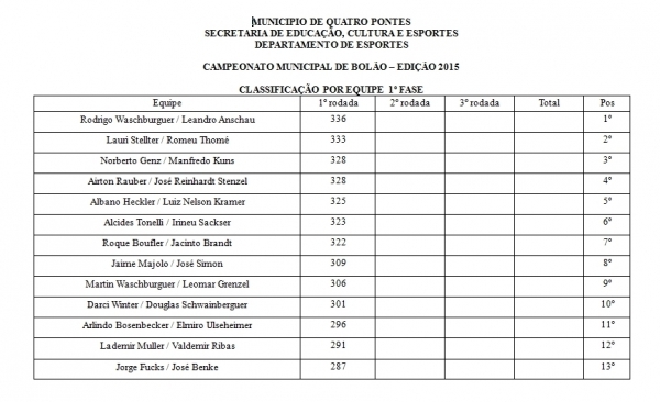 O Departamento de Esportes da Prefeitura Municipal de Quatro Pontes está realizando o Campeonato Municipal de Bolão, edição 2015. A primeira rodada válida pela categoria masculino ocorreu no dia 6 de novembro e as próximas rodadas serão nos dias 13 e 20. A grande final será no dia 27.