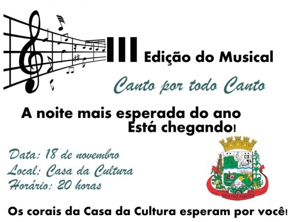 Mais um grande espetáculo realizado pelo Departamento de Cultura da Prefeitura do Município de Quatro Pontes aguarda a população quatropontense e de toda a região amanhã (18). O Musical “Canto por todo o Canto”, acontecerá na Casa da Cultura a partir das 20 horas.