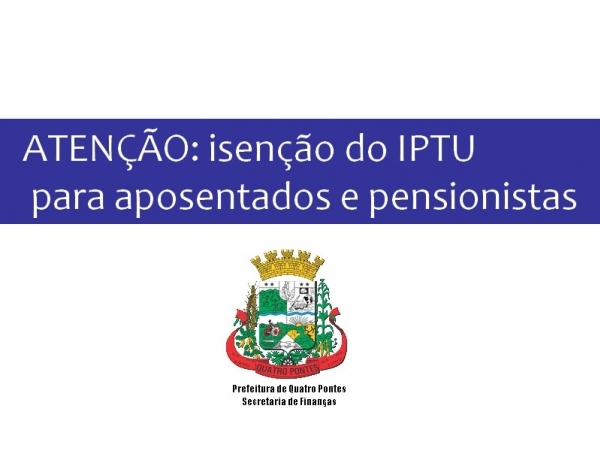 O Município de Quatro Pontes através da Secretaria de Finanças comunica aos aposentados e pensionistas com direto a isenção do IPTU que o prazo para requerimento vai até o dia 30 de novembro, na Prefeitura. É preciso apresentar cópia do CPF, Identidade, Conta de Luz, comprovante do benefício e a certidão de óbito do cônjuge em caso de viuvez.