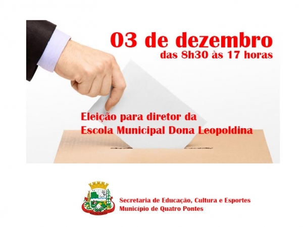 Nesta quinta-feira (03) acontecerá a eleição para o cargo de diretor da Escola Municipal Dona Leopoldina, Quatro Pontes. A votação será das 8h30 ás 17 horas, na instituição de ensino. Poderão votar o corpo docente em exercício na escola, os demais servidores nela lotados e em exercício, os pais de alunos nela matriculados ou, em sua falta, os respectivos responsáveis legais, sendo um por família e a Secretaria Municipal de Educação, Cultura e Esportes.
